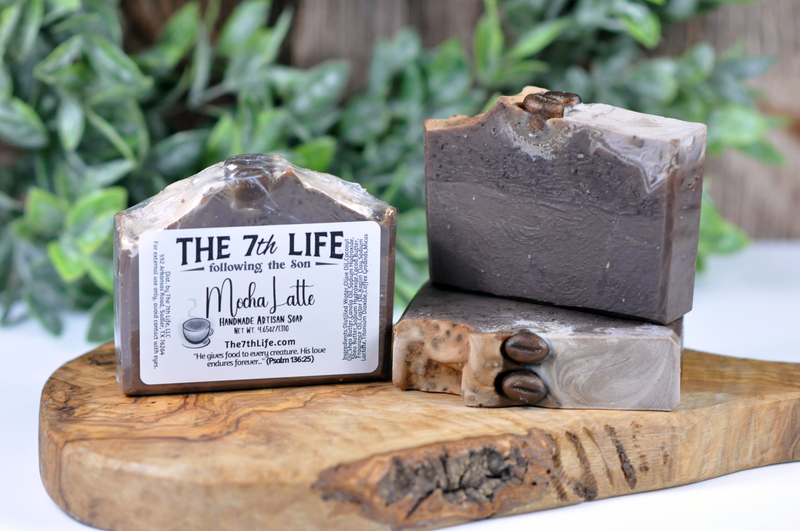 Energize with Mocha Latte handmade palm-free soap—rich coffee, cream, decadent chocolate & sweet vanilla scent, plus coffee grounds in half the bar for gentle scrubbing. Small-batch crafted in Texas, chemical-free, rich lather for soft, rejuvenated skin. Perfect pick-me-up or thoughtful gift!
