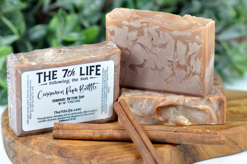 Warm up with Cinnamon Rum Brittle handmade luxury bath soap—buttery dark rum, brown sugar, cinnamon sticks, nutmeg, crushed nuts, caramelized sugar, butter & vanilla. Small-batch crafted in Texas, chemical-free, rich lather for soft, nourished skin. Cozy comfort or perfect seasonal gift!