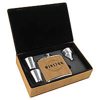 Give a premium gift with this Custom Laser Engraved Leatherette Flask Gift Set. Includes 6 oz flask, filling funnel, and two matching shot glasses. Richly textured laserable leatherette rivals real leather—water-resistant and easy to clean. Precision laser engraving delivers stunning high-contrast results. Ideal for weddings, groomsmen, bridesmaids, birthdays, or corporate rewards.